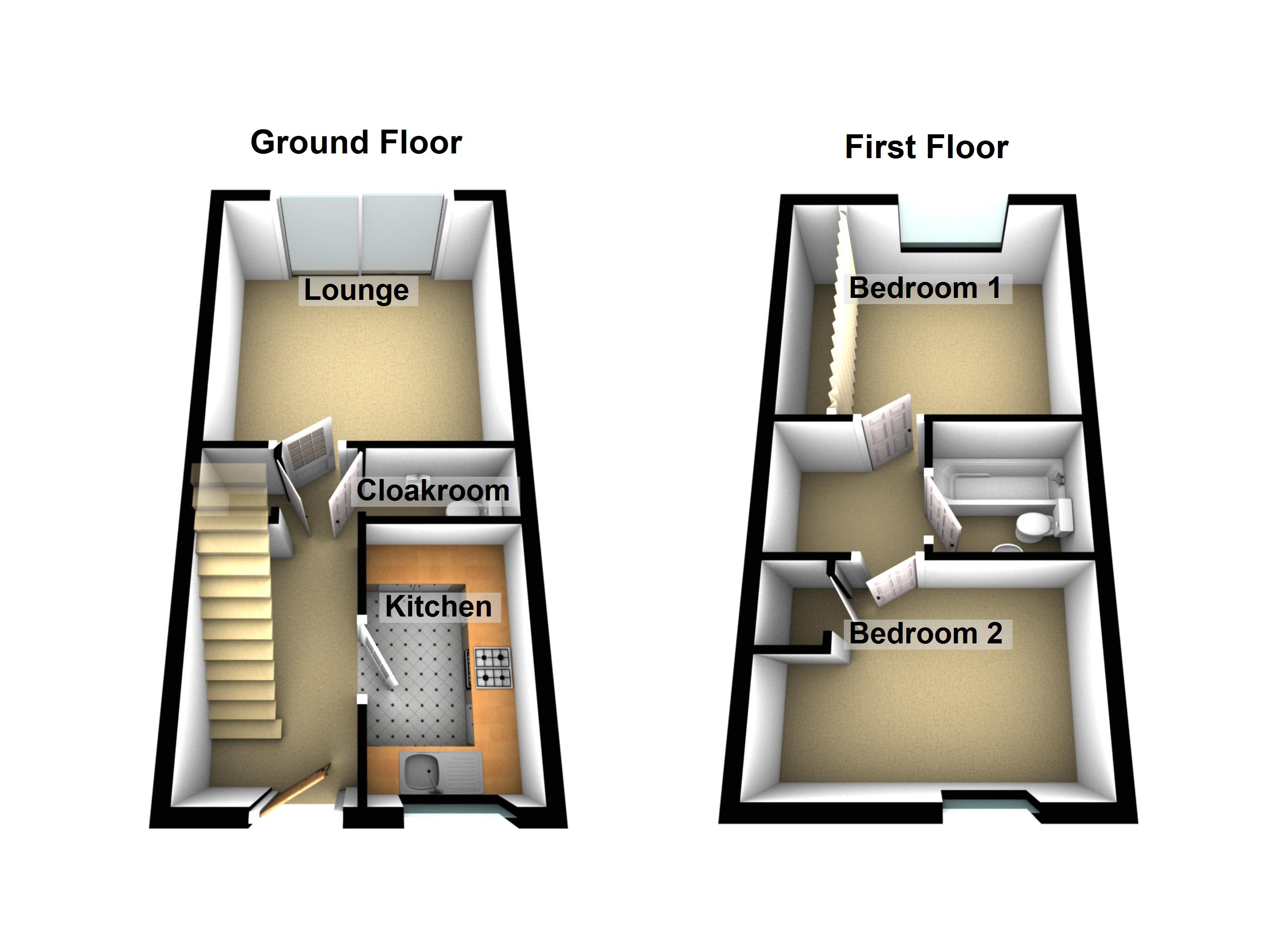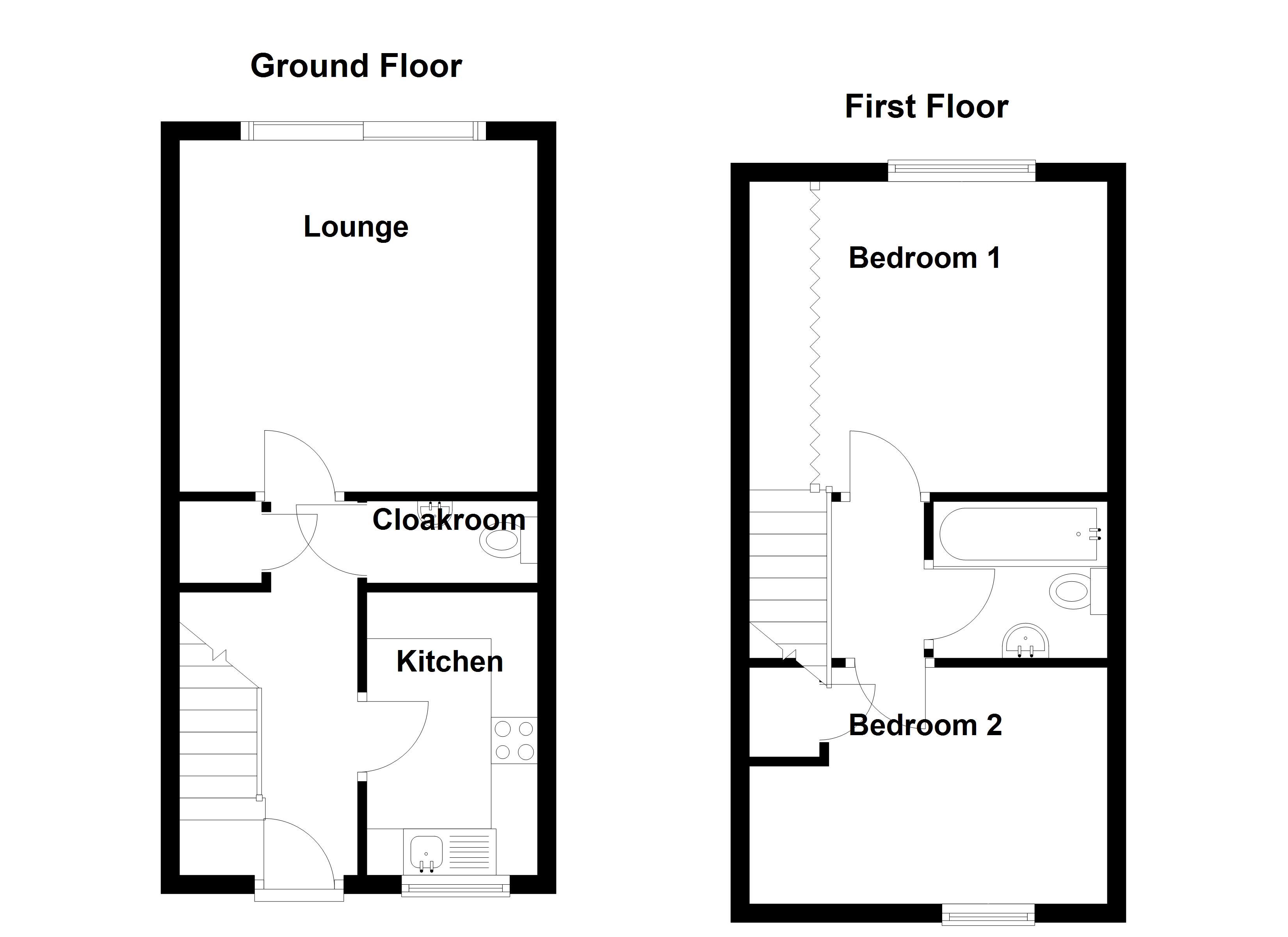 The ground floor comprises a welcoming entrance hall, contemporary kitchen, downstairs WC, and a spacious lounge/diner with views over the rear garden. Upstairs, you'll find two generous double bedrooms and a well-appointed family bathroom.